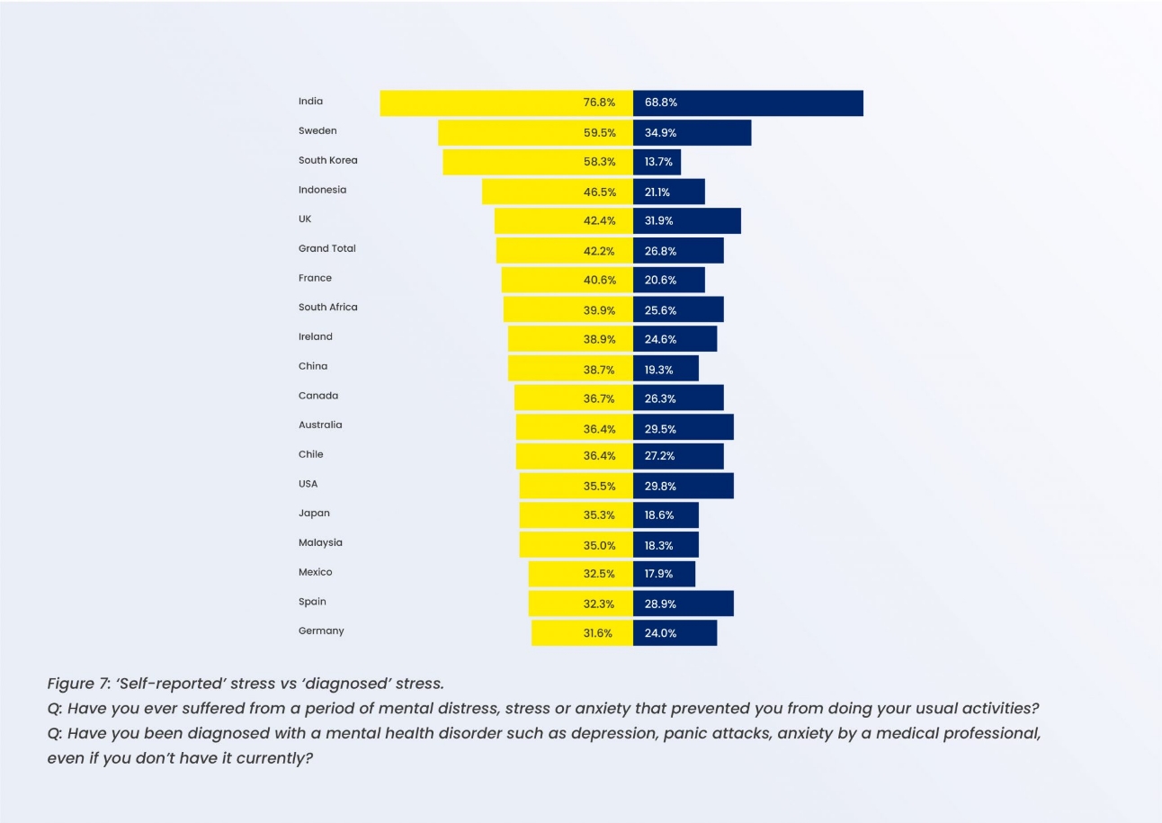 Après avoir établi la réalité de la stigmatisation de la santé mentale (Fig. 1), les données de l’étude GCS révèlent un écart entre les personnes ayant signalé avoir souffert du stress (42,2 %) et celles qui ont fait établir un diagnostic formel (26,8 %), comme l’illustre la Figure 7.