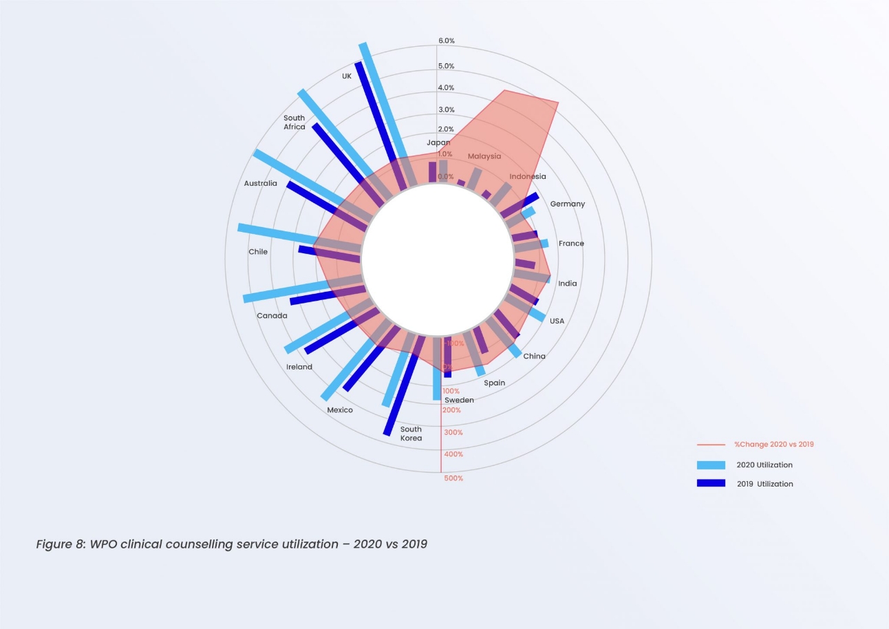 Les résultats sont cohérents par rapport aux chiffres mondiaux de recours à l’accompagnement en ligne de WPO. Malgré une multiplication par dix en mars/avril 2020, le nombre total de personnes utilisant les services ne représentait que moins de 3 % de tous les employés invités à utiliser le service. Ce résultat diffère néanmoins en fonction du pays (Fig. 8). Une analyse plus approfondie s’impose, pour comprendre à quel point ce service sera efficace au fil de la transition vers un mode de vie plus numérique.