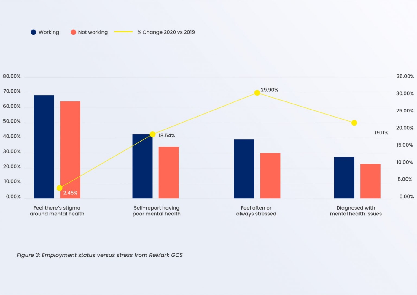 Perhaps paradoxically, when comparing employed and unemployed populations, the figures highlight a marked difference, showing heightened stress levels among those working. People in employment: