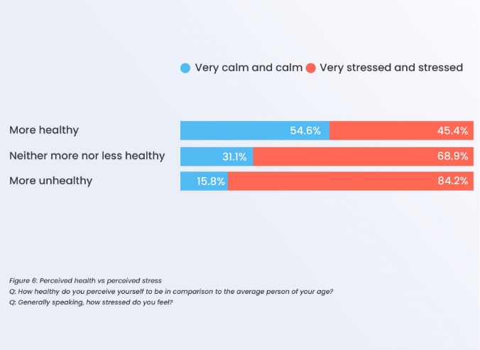 Nearly 9 in 10 people worldwide believe physical and mental health are linked. There is a clear correlation of self-perception of healthiness and stress. When people feel calm, they tend to feel more healthy, and vice versa (Fig. 6).